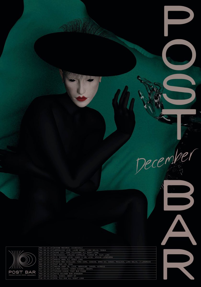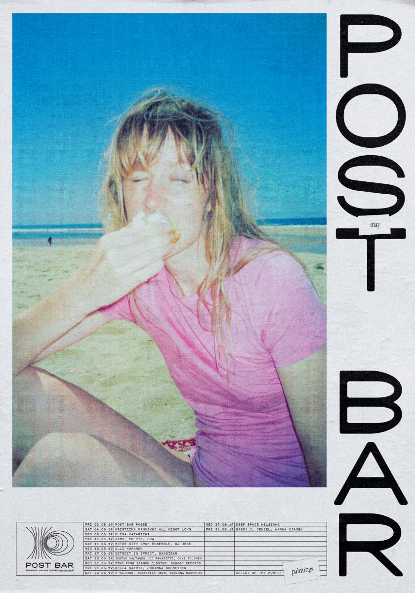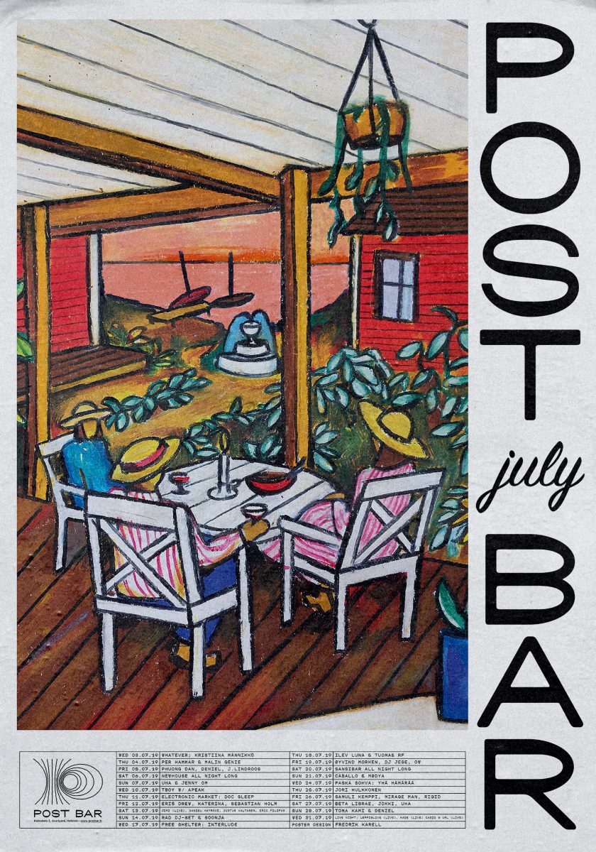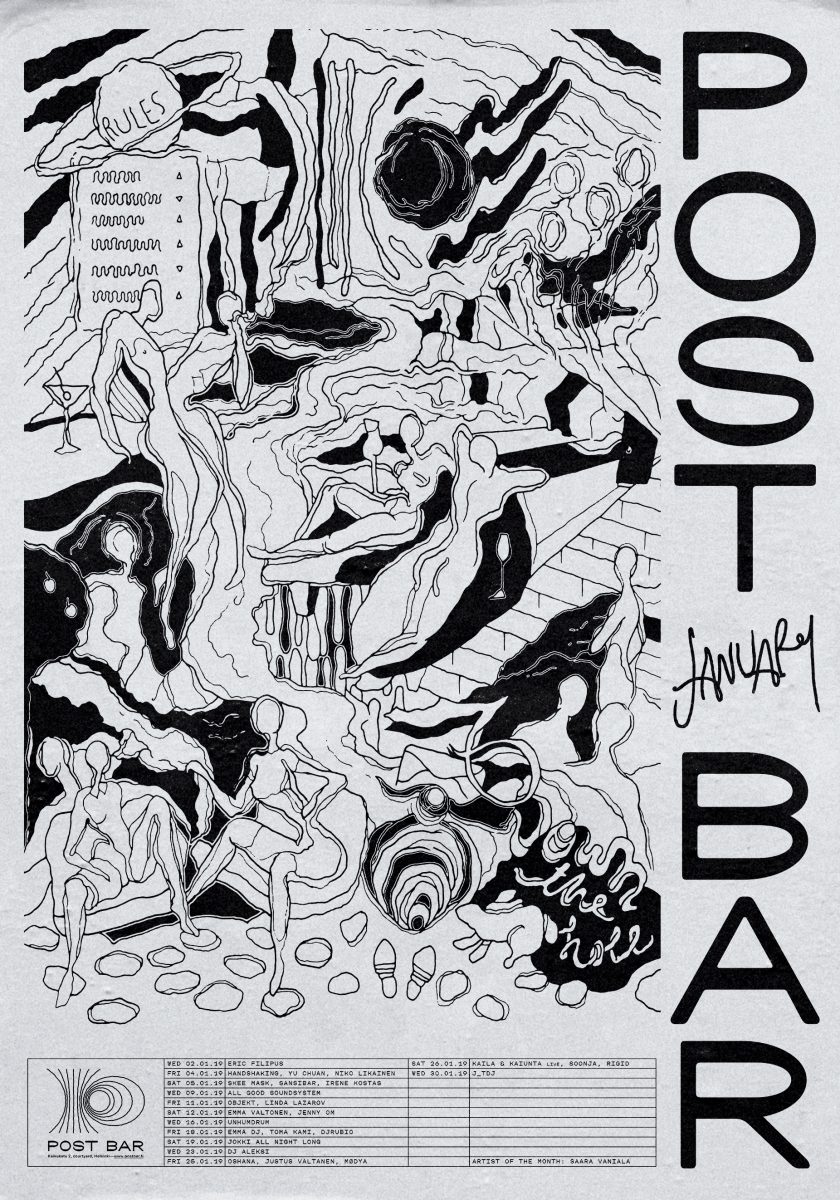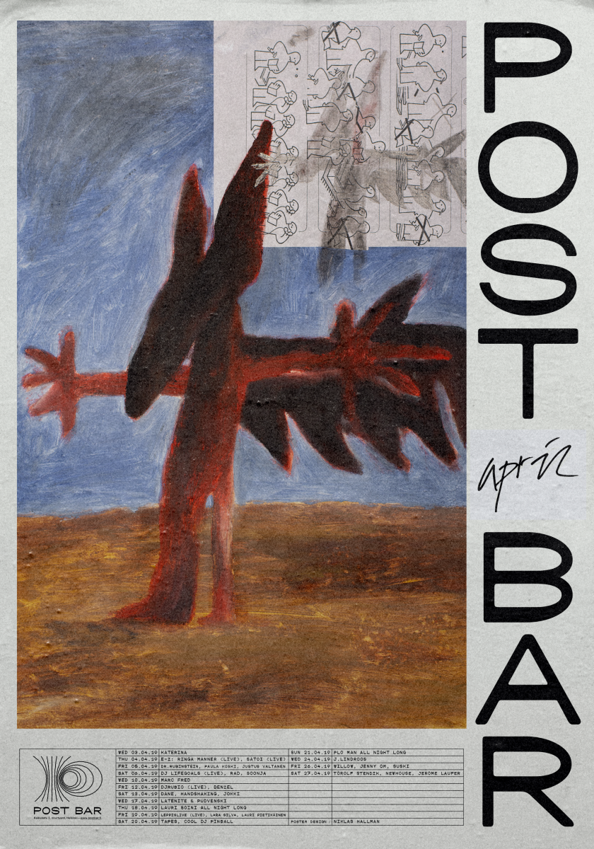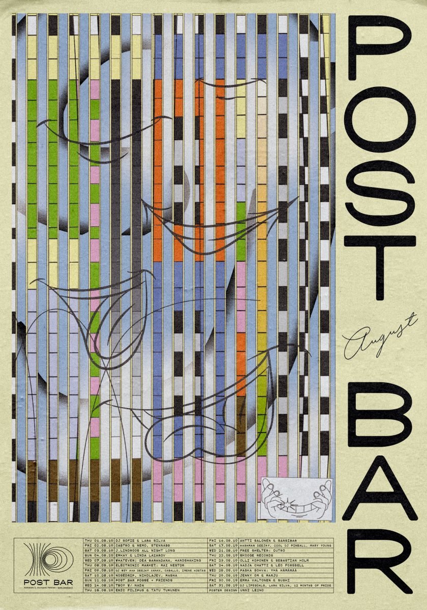 Eevi Kolinen is a graphic designer from Helsinki and a nearly graduate of Design Institute of Lahti. While she lived in Berlin she found her passion for graphic art and has been enthusiastic about it ever since. The poster for Post Bar is a part of her ongoing Keho -series.