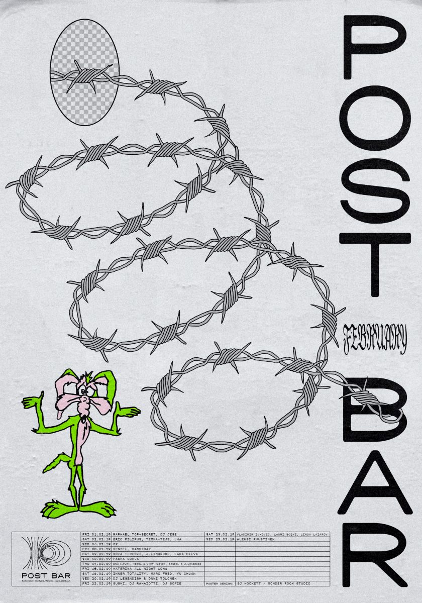 SJ describes the work done for Post Bar: “The poster imagery is inspired by my most recent body of work/work in progress entitled ‘Eternal Life Motorsports’. The works visually explore concepts of endless repetition and eternity; these themes are easily translated to (something) within electronic/club music. The Coyote infinitely repeats its chase with Roadrunner, the barbed wire links are reiterations with no decipherable beginning, or end.”