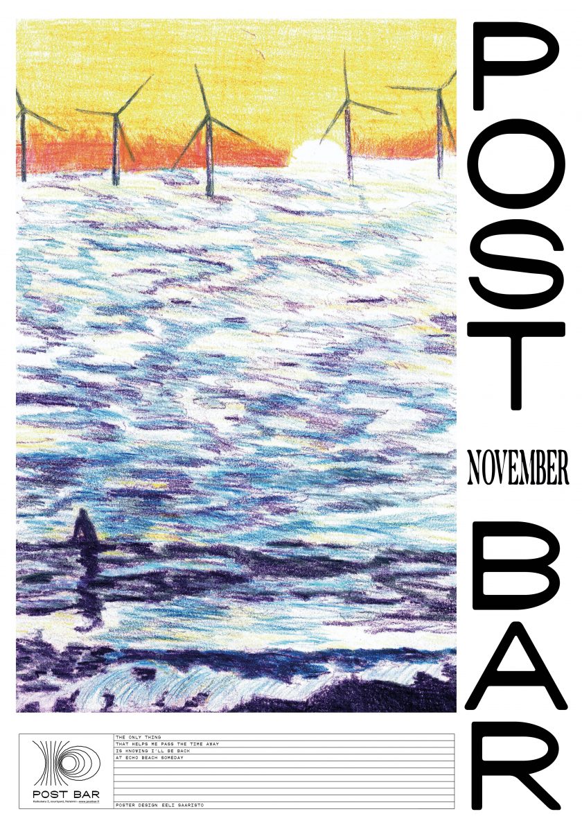 As a basis for the commissioned Post bar poster Eeli choose to depict the wait of a wave by a surfer, a timely fitting subject.